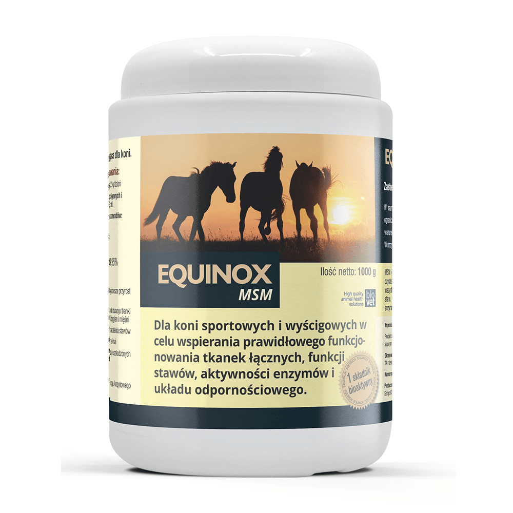 Equinox MSM to najwyższej jakości siarka organiczna o 100% czystości, niezbędna dla zdrowia układu ruchu i tkanki łącznej. Preparat skutecznie wspiera produkcję kolagenu i keratyny, co przekłada się na mocne ścięgna, elastyczne stawy oraz zdrowy róg kopytowy i lśniącą sierść. Działa przeciwzapalnie i regenerująco, przyspieszając powrót do sprawności po kontuzjach oraz redukując sztywność mięśni.
