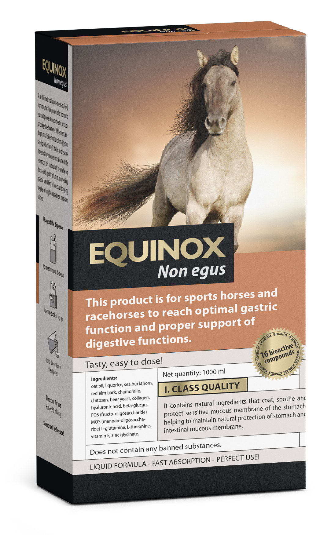 Equinox Nonegus to płynna, bogata w naturalne składniki mieszanka uzupełniająca dla wszystkich koni – sportowych, wyścigowych i wrażliwych. Opracowana z myślą o wsparciu żołądka i układu pokarmowego, szczególnie w stanach podrażnienia, stresu i po leczeniu wrzodów.