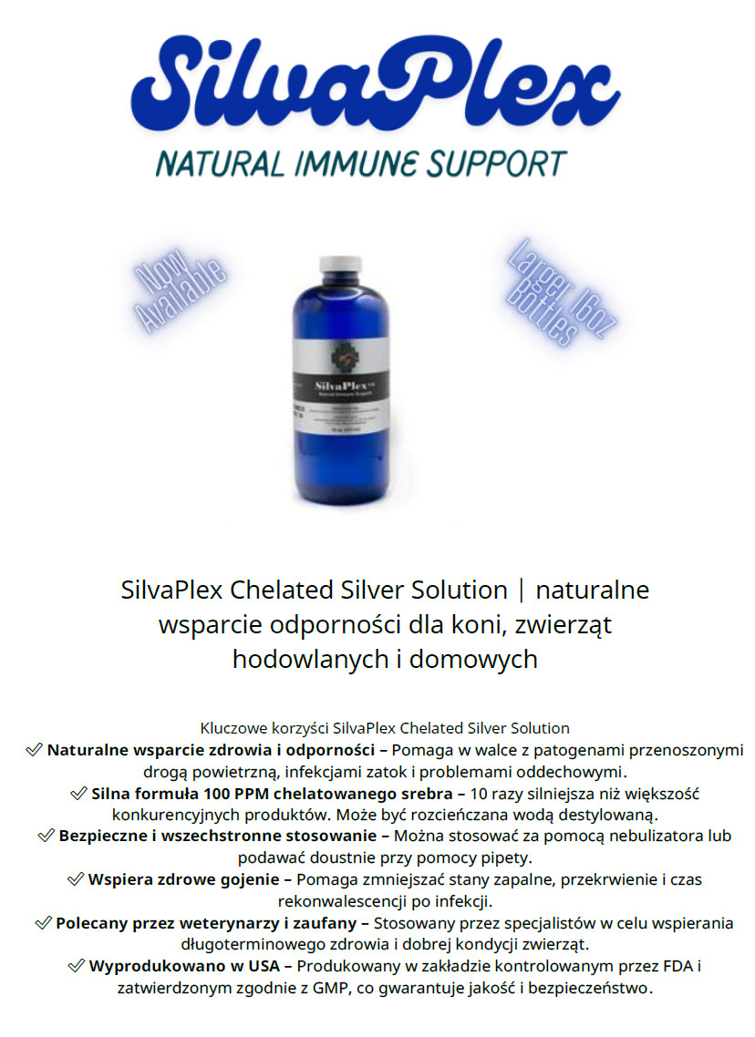 SilvaPlex to naturalny sposób wspierania układu odpornościowego. SilvaPlex działa w błonie śluzowej płuc i pomaga usunąć nadmiar śluzu i (w większości przypadków) bakterii. Najczęstsze choroby układu oddechowego, takie jak zapalenie oskrzeli, infekcje wirusowe i przeziębienia, można skrócić za pomocą nebulizacji SilvaPlex, dzięki czemu wiele koni może trenować, jeździć i biegać po terapii SilvaPlex.