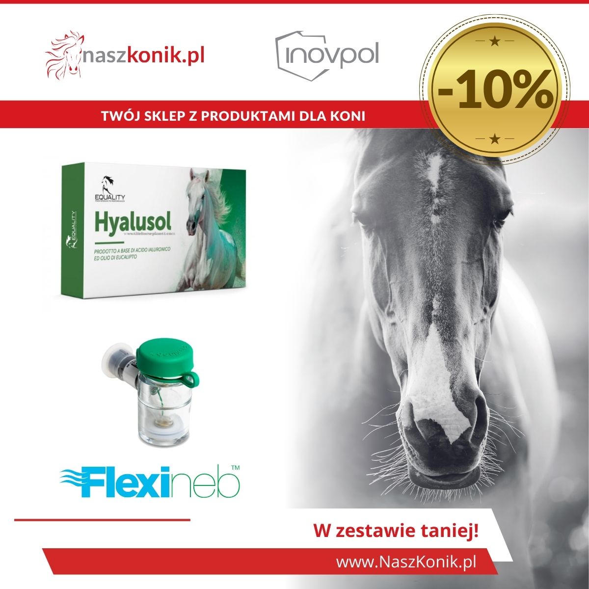 Zestaw kwas hialuronowy dla koni HYALUSOL + pojemnik zielony Flexineb
